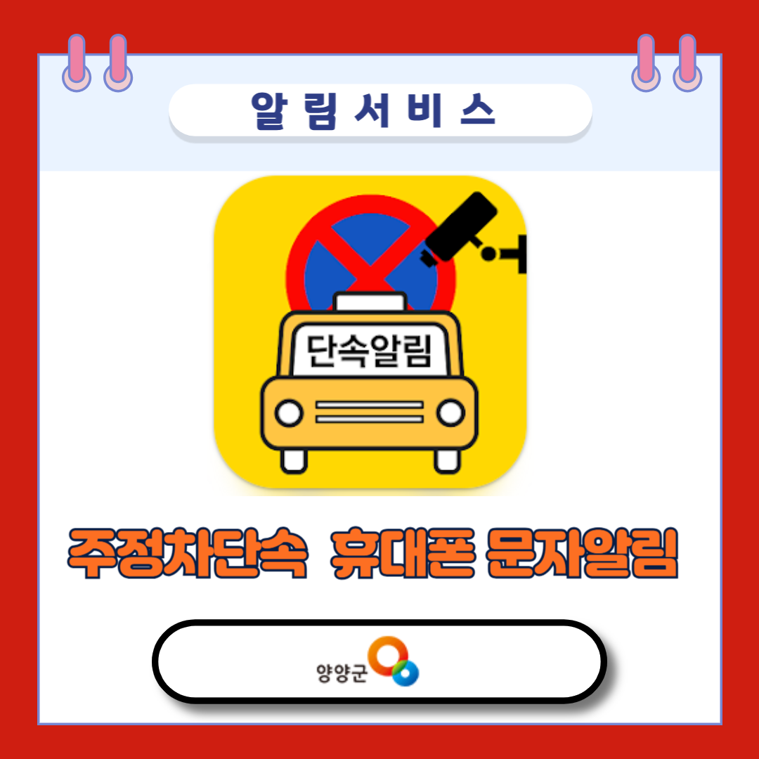 | 인터넷(시, 해당 구청 홈페이지) 및 서면신청 ▷ 인터넷 👉 인터넷 알림서비스 신청하러 가기 👈 ▷ 휴대폰 👉 스마트폰 앱 다운로드 및 알림서비스 신청 👈 ▷ 서면신청 : 양양군청 교통관리과, 각 구청 교통과 인근 동 주민센터 ☞ 인터넷으로 신청하시는 경우에는 서비스가 즉시 제공되며 서면신청 할 때는 접수 7일 후 부터 문자알림 서비스가 제공될 수 있습니다. ▷ 문의 : 양양군청 안전교통과 (☎ 033-670-2172) |