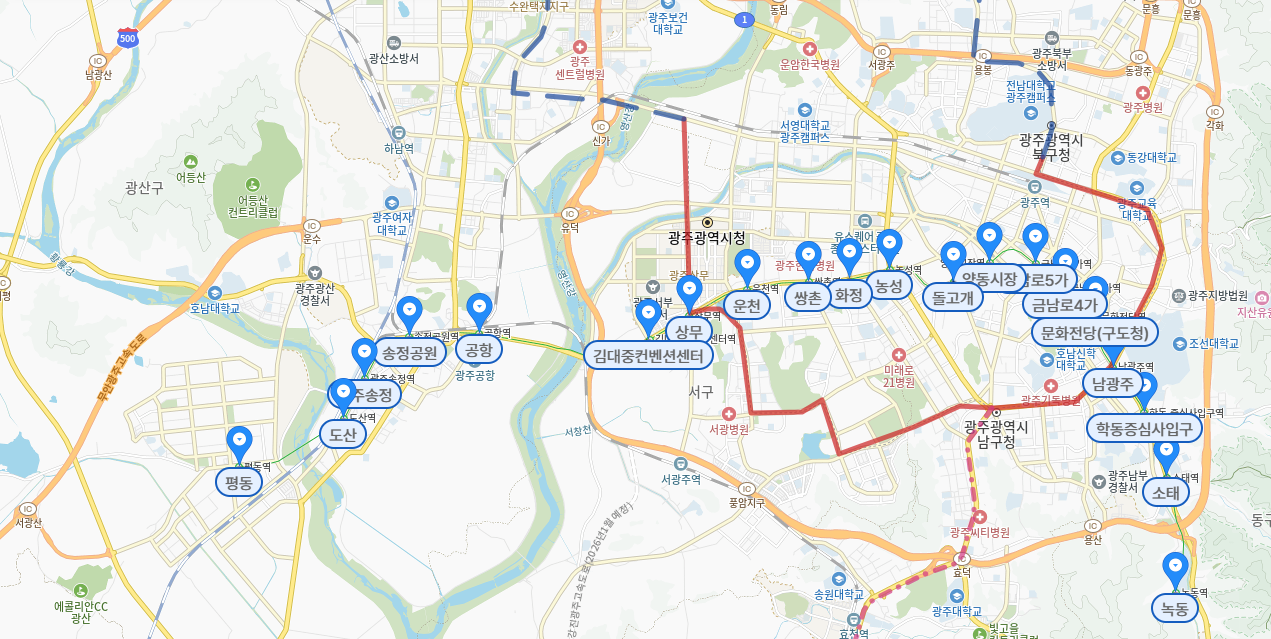 1단계(광주시청, 월드컵경기장, 백운광장, 광주역 등), 2구간(광주역, 전남대, 수완지구, 광주시청 등), 3구간(백운광장, 효천역 등)