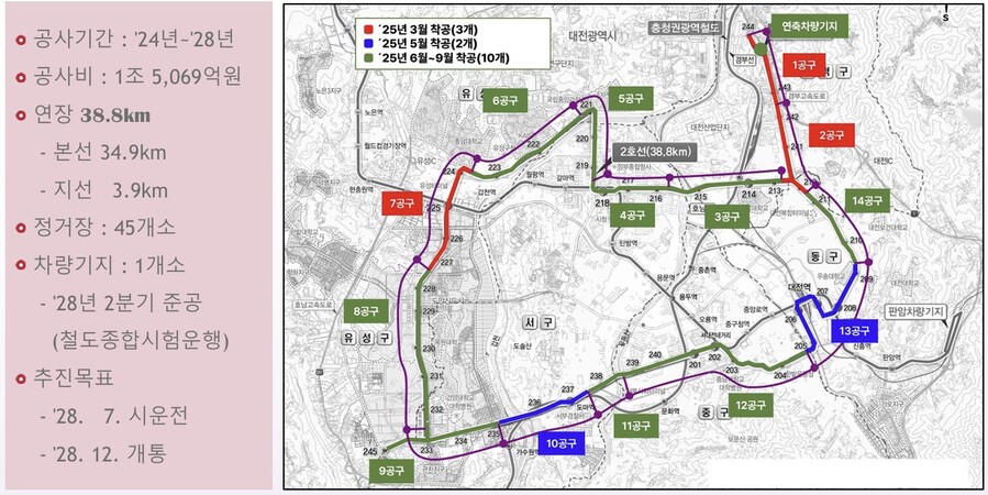 10일 대전시에 따르면 도시철도 2호선은 2024년 착공해 2028년 12월 개통을 목표로 한다. 총사업비는 1조5069억 원이며, 본선 34.9km와 지선 3.9km를 포함한 38.8km 구간에 45개 정거장이 조성된다.