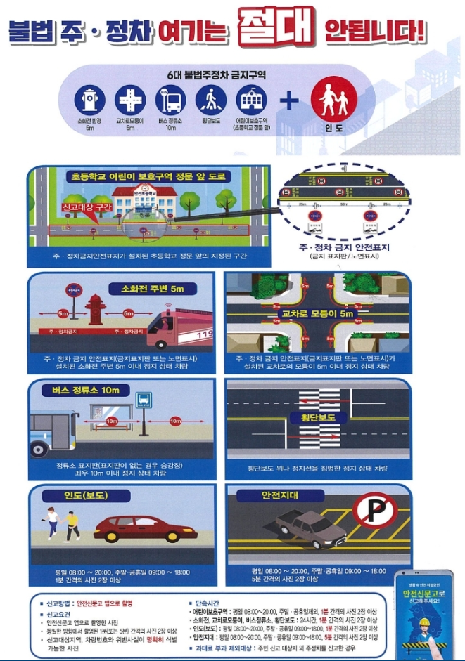 | 안전지대 : 주·정차 금지구역으로 지정된 구간의 안전지대를 침범한 정지 상태 차량 | 평일 08:00~20:00 (주말·공휴일 09:00~18:00) | 5분 |