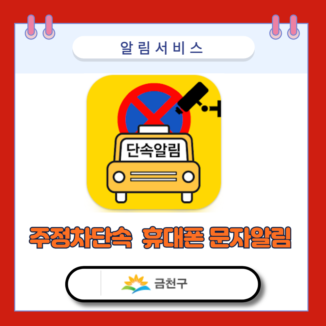 | 인터넷(시, 해당 구청 홈페이지) 및 서면신청 ▷ 인터넷 👉 인터넷 알림서비스 신청하러 가기 👈 ▷ 휴대폰 👉 스마트폰 앱 다운로드 및 알림서비스 신청 👈 ▷ 서면신청 : 서울시 교통관리과, 각 구청 교통과 인근 동 주민센터 ☞ 인터넷으로 신청하시는 경우에는 서비스가 즉시 제공되며 서면신청 할 때는 접수 7일 후 부터 문자알림 서비스가 제공될 수 있습니다. ▷ 문의처 : 금천구청 주차관리과 ☎ 02-2627-1764 |