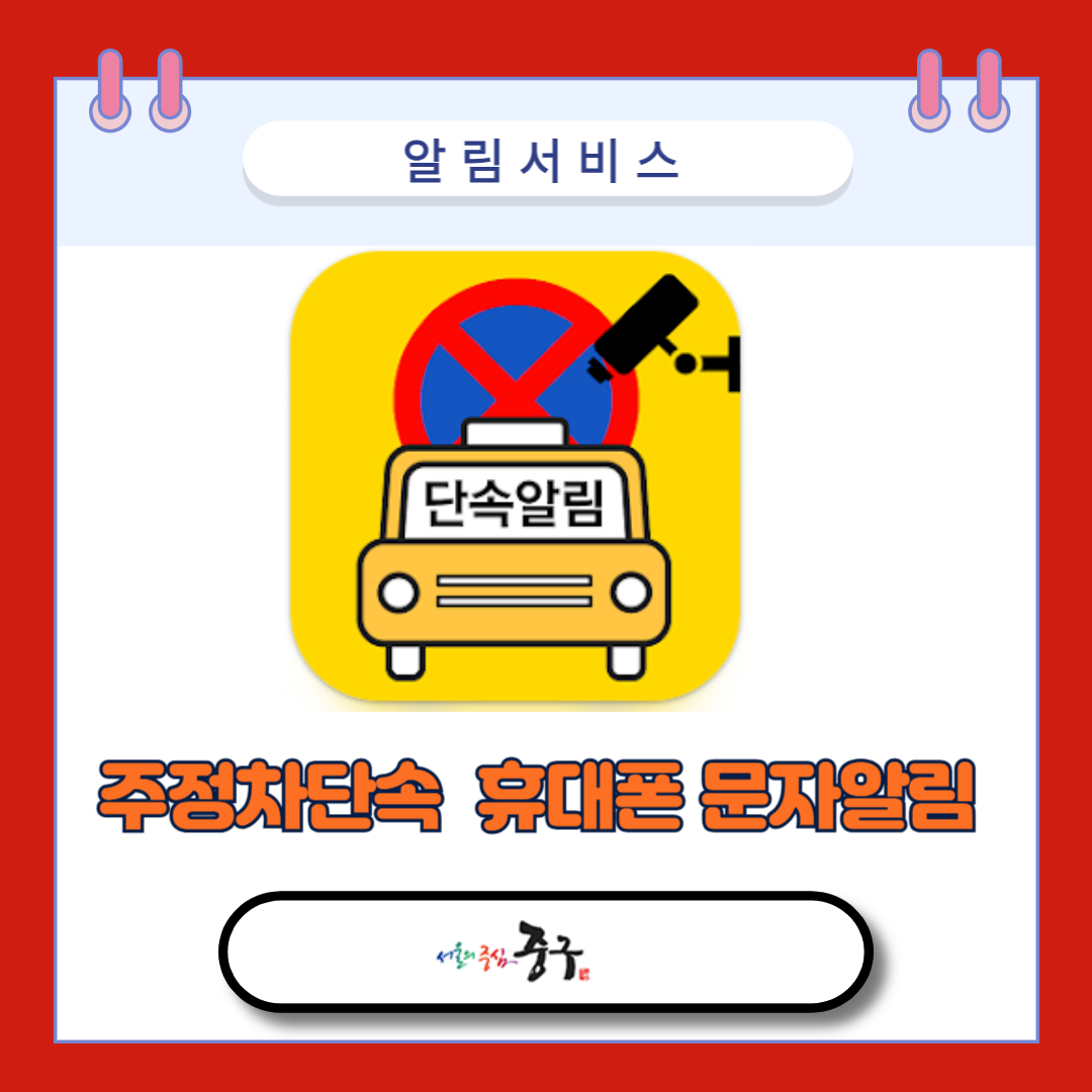 | 인터넷(시, 해당 구청 홈페이지) 및 서면신청 ▷ 인터넷 👉 인터넷 알림서비스 신청하러 가기 👈 ▷ 휴대폰 👉 스마트폰 앱 다운로드 및 알림서비스 신청 👈 ▷ 서면신청 : 서울시청 교통관리과, 각 구청 교통과 인근 동 주민센터 ☞ 인터넷으로 신청하시는 경우에는 서비스가 즉시 제공되며 서면신청 할 때는 접수 7일 후 부터 문자알림 서비스가 제공될 수 있습니다. ▷ 문의 : 중구청 주차관리과 ☎ 02-3396-6246 |