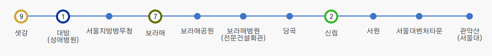 환승역은 샛강역에서 9호선, 대방역에서 1호선, 보라매역에서 7호선, 신림역에서 2호선입니다.