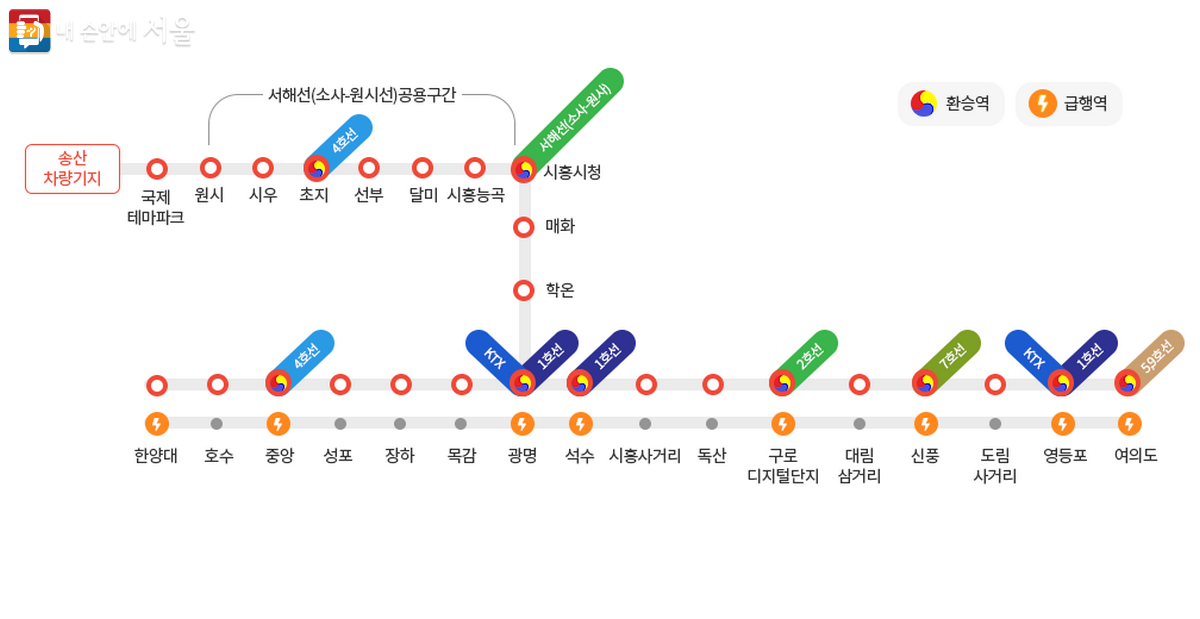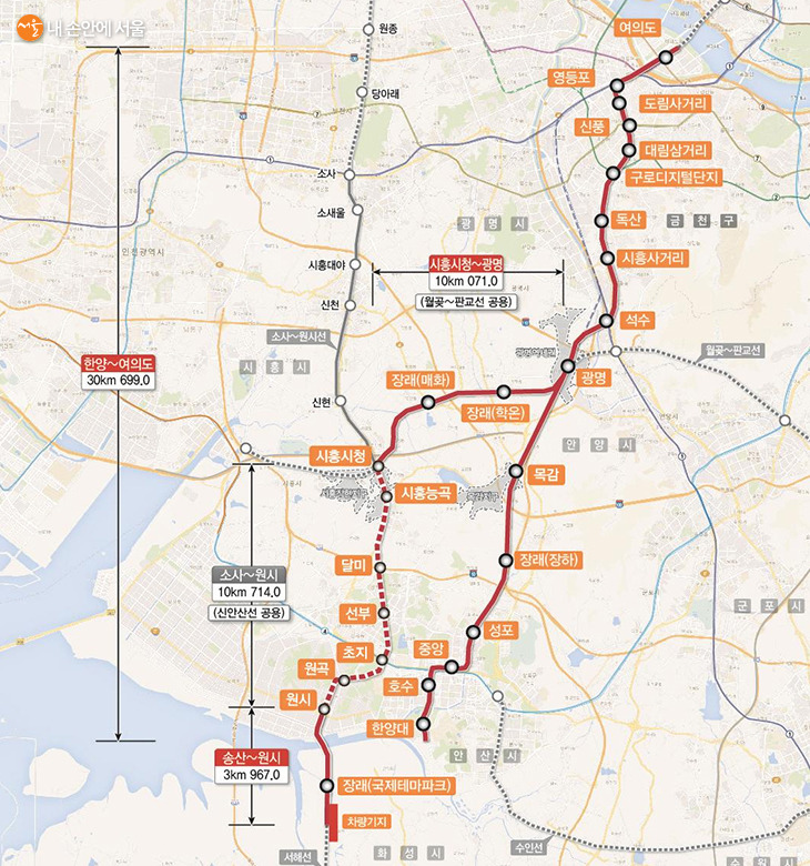 환승역으로는 여의도역(지하철 5·9호선), 영등포역(1호선·무궁화호·새마을호), 신풍역(7호선), 구로디지털단지역(2호선), 석수역(1호선), 광명역(KTX·월곶~판교선 예정), 중앙역(수인선), 시흥시청역(소사~원시선), 초지역(KTX 예정, 4호선), 등이 계획돼 있습니다.