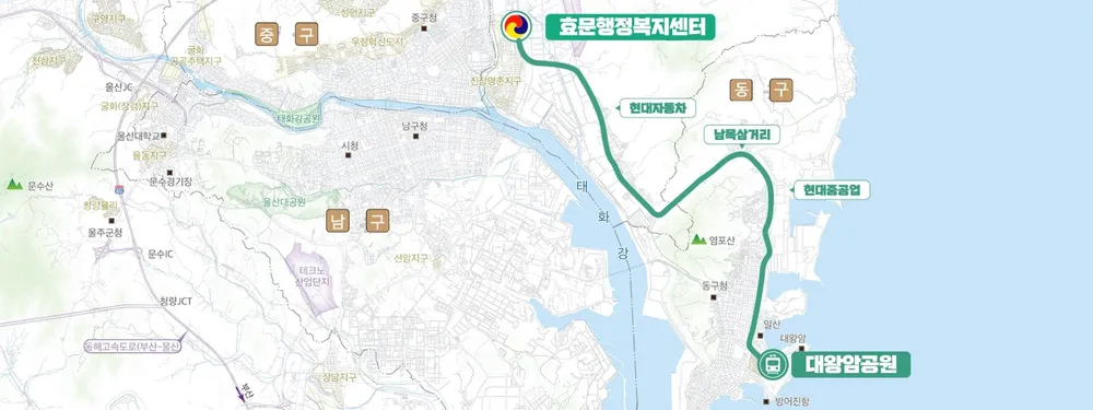 ▶ 구체적으로 대왕암공원, 방어진순환도로, 염포로, 효문사거리를 지나므로 동구 내부 중심지를 관통하는 노선이자 현대중공업과 현대자동차를 경유하는 노선이라 할 수 있습니다.