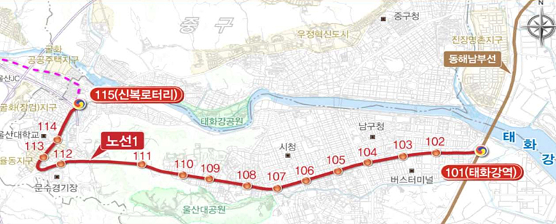 그렇게 되면 울산도시철도 1호선과 연계될 것입니다.(울산도시철도 1호선의 기점은 태화강역임)