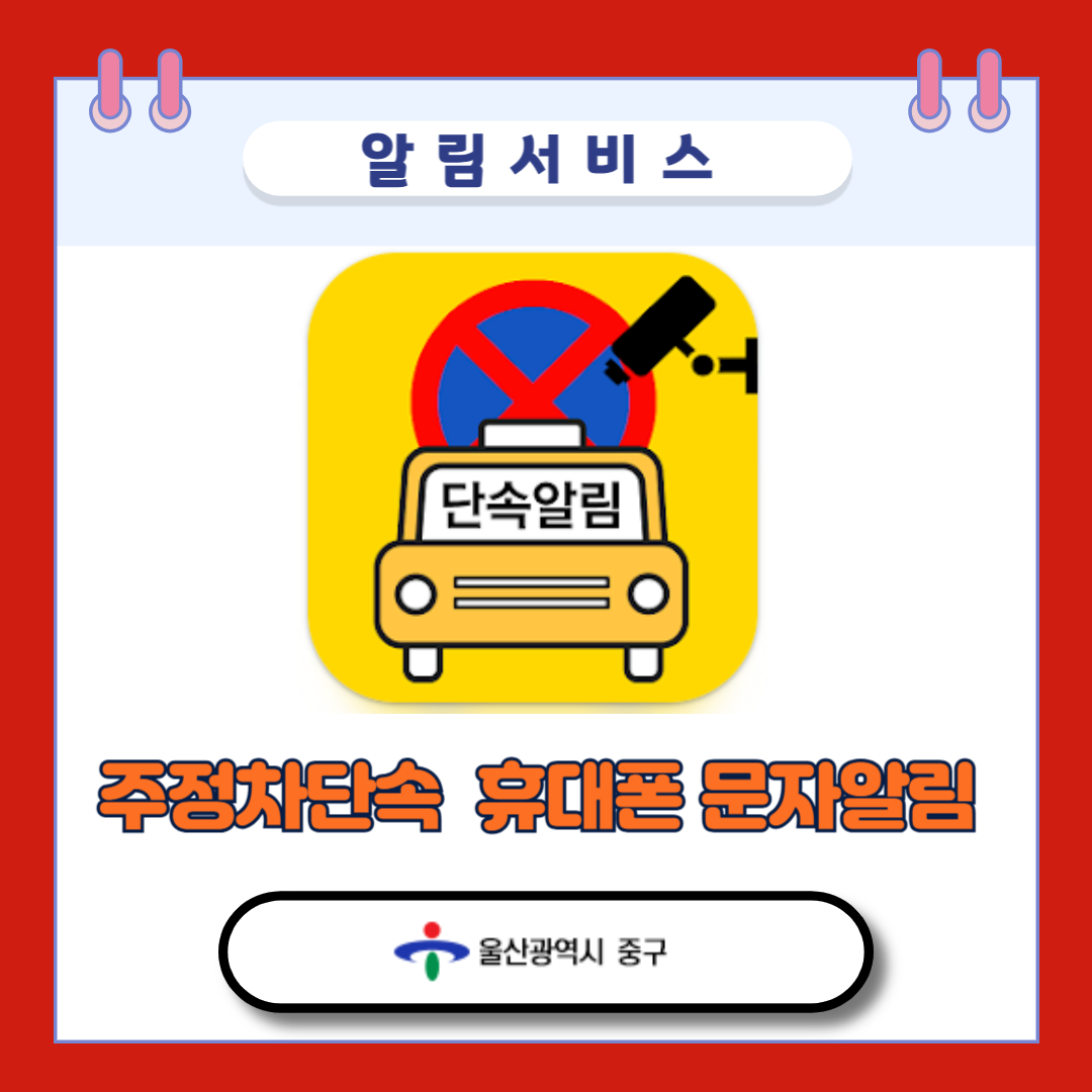| 인터넷(시, 해당 구청 홈페이지) 및 서면신청 ▷ 인터넷 👉 인터넷 알림서비스 신청하러 가기 👈 ▷ 휴대폰 👉 스마트폰 앱 다운로드 및 알림서비스 신청 👈 ▷ 서면신청 : 중구청 교통관리과, 각 구청 교통과 인근 동 주민센터 ☞ 인터넷으로 신청하시는 경우에는 서비스가 즉시 제공되며 서면신청 할 때는 접수 7일 후 부터 문자알림 서비스가 제공될 수 있습니다. ▷ 문의 : 울산 중구청 교통과 ☎ 052-290-3980 |