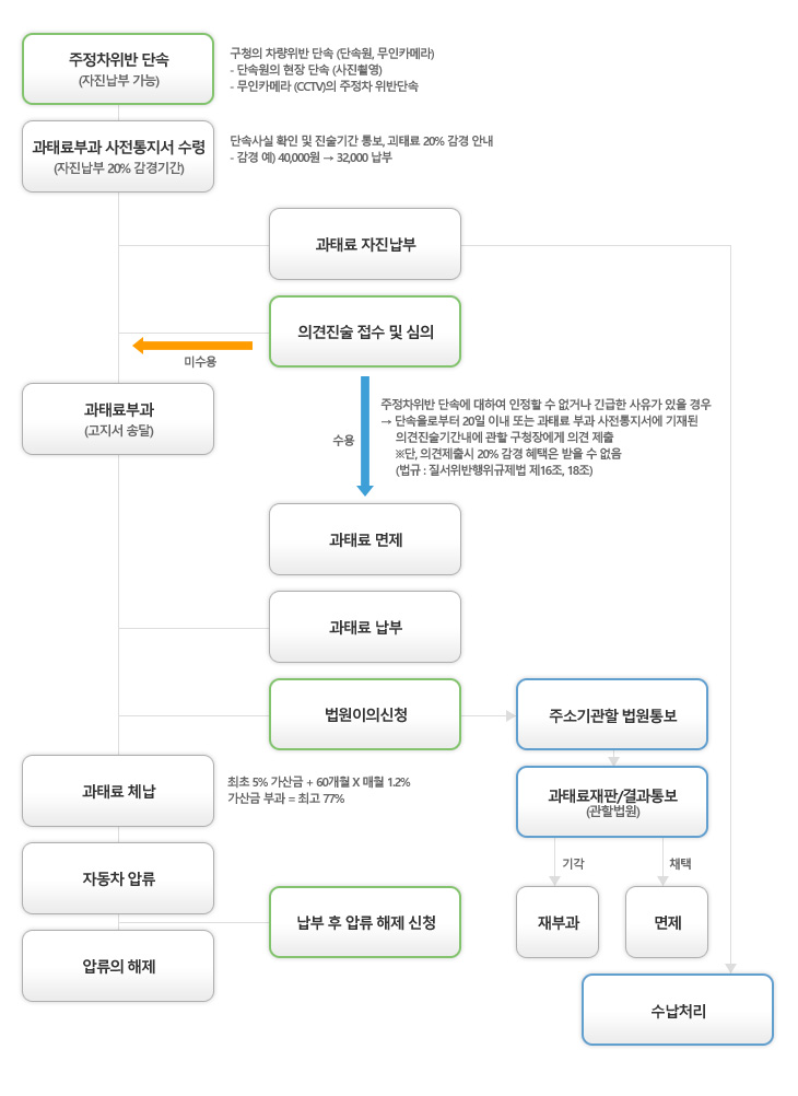 ▶ 사전통지서 발부일로부터 20일 이내 또는 과태료 부과 사전통지서에 기재된 의견진술 기간 내에 그 차의 사용자 또는 운전자는 서면 및 인터넷으로 의견을 진술할 기회가 주어지며, 그 사유가 정당하다고 인정되는 때에는 과태료 부과 제외 대상으로 처리됩니다.