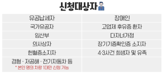 | 국가유공자 및 수권자 | 유공자증서 소지자 또는 수권자 명의 자동차 (전몰군경, 전상군경, 순직군경, 공상군경, 무공수훈자, 보국수훈자, 참전유공자, 4.19혁명 상이자, 공상공무원, 특별공로상이자 등) | ||