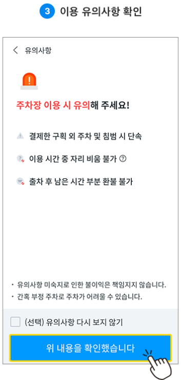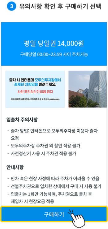 | 시간권, 종일권,야간권, 주말권 등 선택적으로 사용할 수 있습니다. | 입출차는 1회만 가능하기에 한번 나가면 다시 들어올 수 없습니다. |