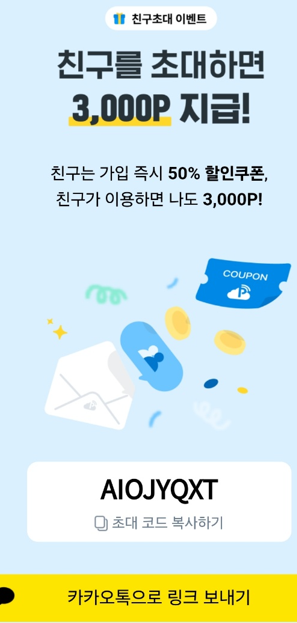 친구의 추천으로 초대코드 받고 신규가입하면 50% 할인쿠폰 지급