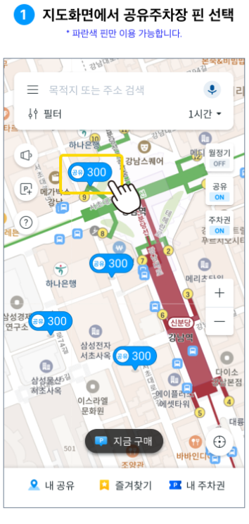 ❇ 지도화면에서 공유주차장 핀 선택하여 사전예약하고 사용가능합니다.