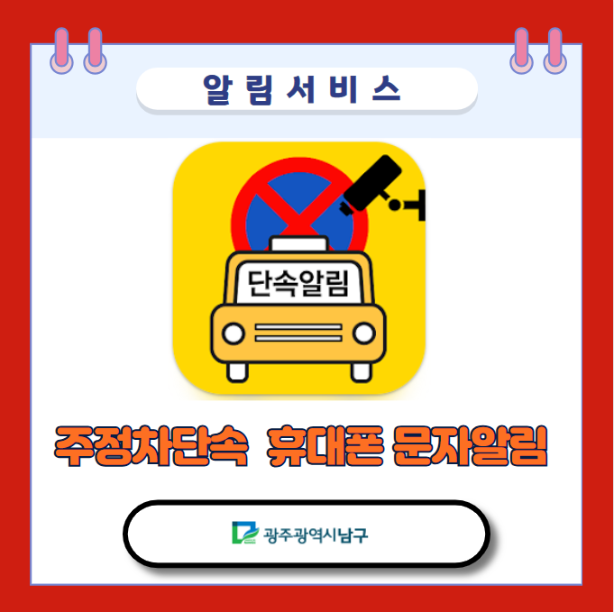 | 인터넷(시, 해당 구청 홈페이지) 및 서면신청 ▷ 인터넷 👉 인터넷 알림서비스 신청하러 가기 👈 ▷ 휴대폰 👉 스마트폰 앱 다운로드 및 알림서비스 신청 👈 ▷ 서면신청 : 남구청 교통관리과, 각 구청 교통과 인근 동 주민센터 ☞ 인터넷으로 신청하시는 경우에는 서비스가 즉시 제공되며 서면신청 할 때는 접수 7일 후 부터 문자알림 서비스가 제공될 수 있습니다. ▷ 문의 : 남구청 교통과 ☎ 062-607-4226 |