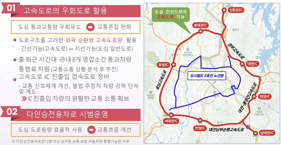 대전시는 공사로 인한 교통 불편을 줄이기 위해 △고속도로 우회도로 활용 △다인승 전용차로 시범운영 △대중교통 이용 활성화 △우회도로 신설 및 기존 도로정비 △신호체계 최적화 △민원 대응 강화를 주요 대책으로 내세웠다.
