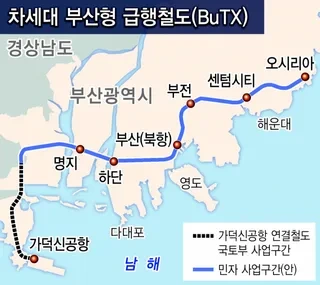 부산형 급행철도(BuTX)은 가덕신공항을 시점으로 명지, 하단, 부산북항을 거쳐 부전, 센텀시티, 오시리아까지 운행하는 급행 철도다.