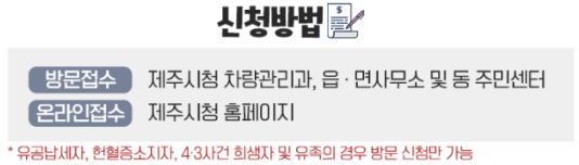 제주 4.3사건 희생자 및 유족, 헌혈증 소지자, 유공납세자, 공동명의, 법인차량의 경우 온라인 신청이 되지 않습니다. 주차장 및 읍면동 주민센터에 문의바랍니다.