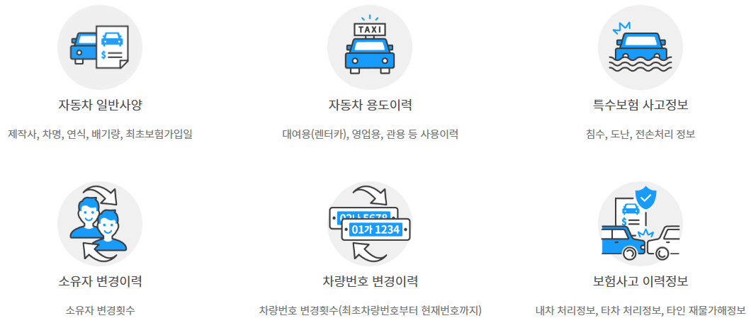 - 1996년 이후 보험사에 접수된 사고/수리 정보를 묶어 한 대의 차량 히스토리를 통합해서 제공합니다.